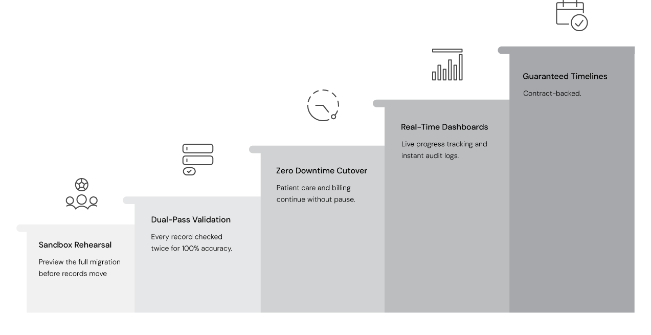 Proven playbooks for Epic, Avatar, Meditech, Practice Fusion → Cerner Millennium.